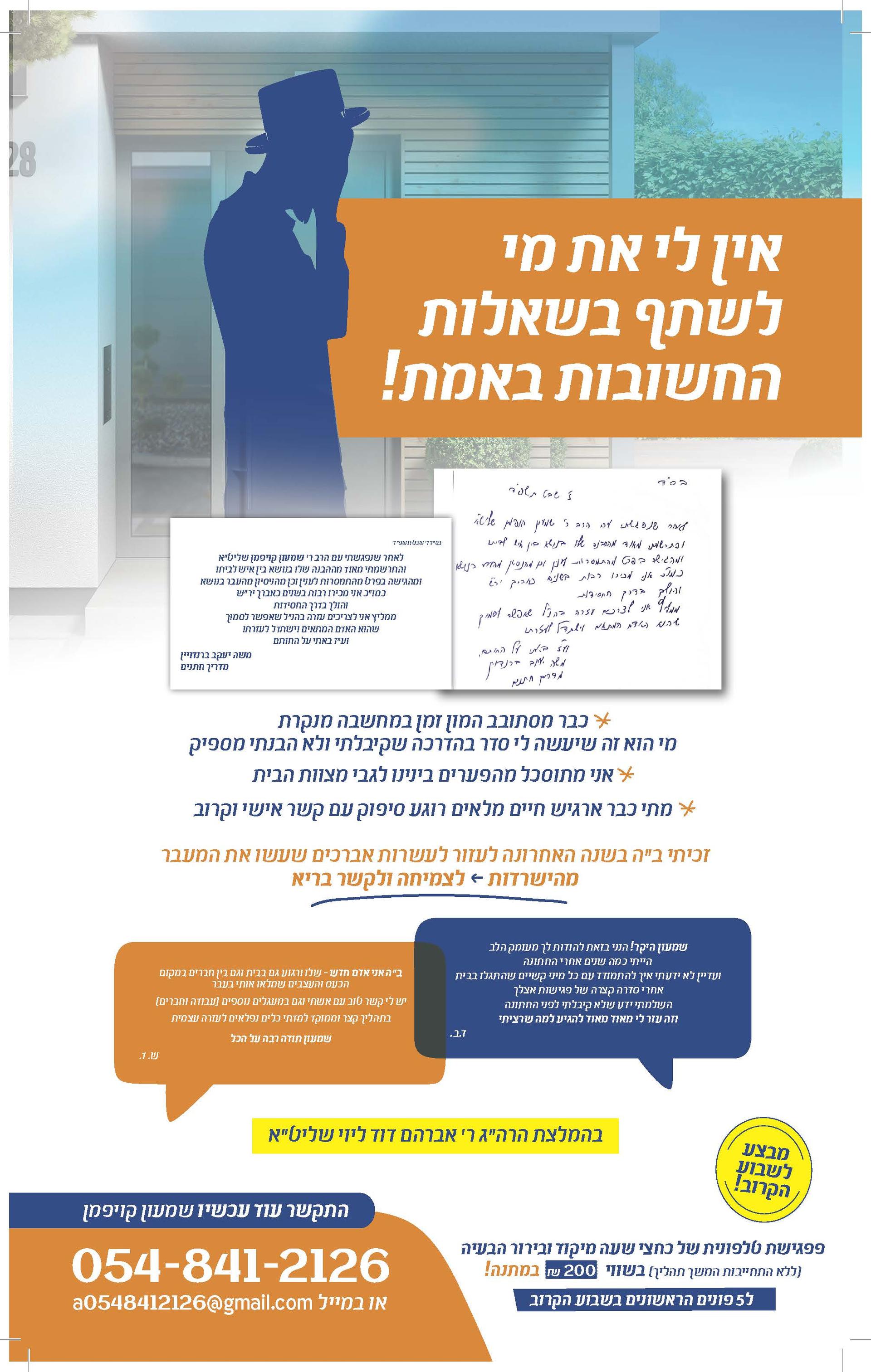 ל 4 הראשונים שיפנו עד למוצ"ש פרשת בלק ב 12 בלילה [ללא התחייבות המשך תהליך] המפגשים בירושלים / בית שמש / ביתר עילית או בשיחה טלפונית בהמלצת הרה"ג ר' אברהם דוד ליוי שליט"א