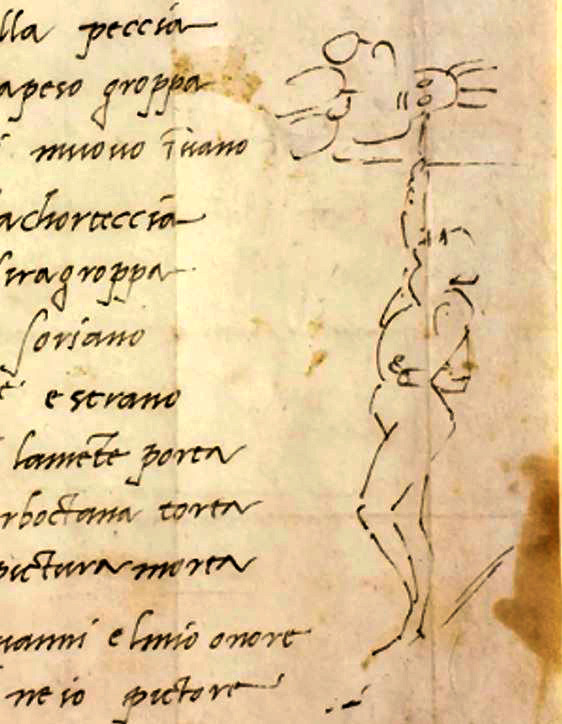 באיור שמימין נראה אנג'לו עומד מלא קומתו, אוחז מכחול ארוך בקצהו ומצייר. כל צייר יודע שנדרש מרווח גדול והכרחי בין העין ובין היצירה. כך נוצרת זווית ראיה רחבה יותר. הצייר אף נוהג להרחיק את הציור ולבחון אותו במבט פרספקטיבי. כך נהג לעשות גם מיכאל אנג'לו כאשר ירד מן הפיגום אל הקרקע כדי לקבל תמונה רחבה יותר על מהלך העבודה. |